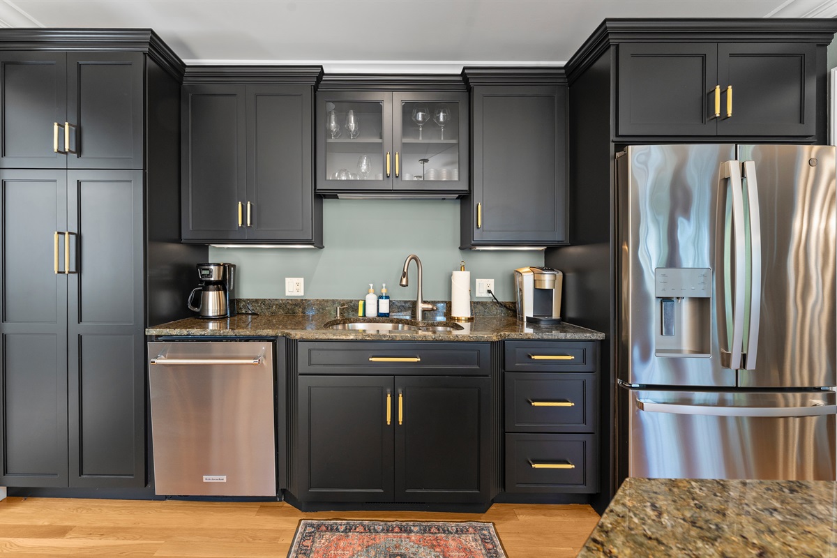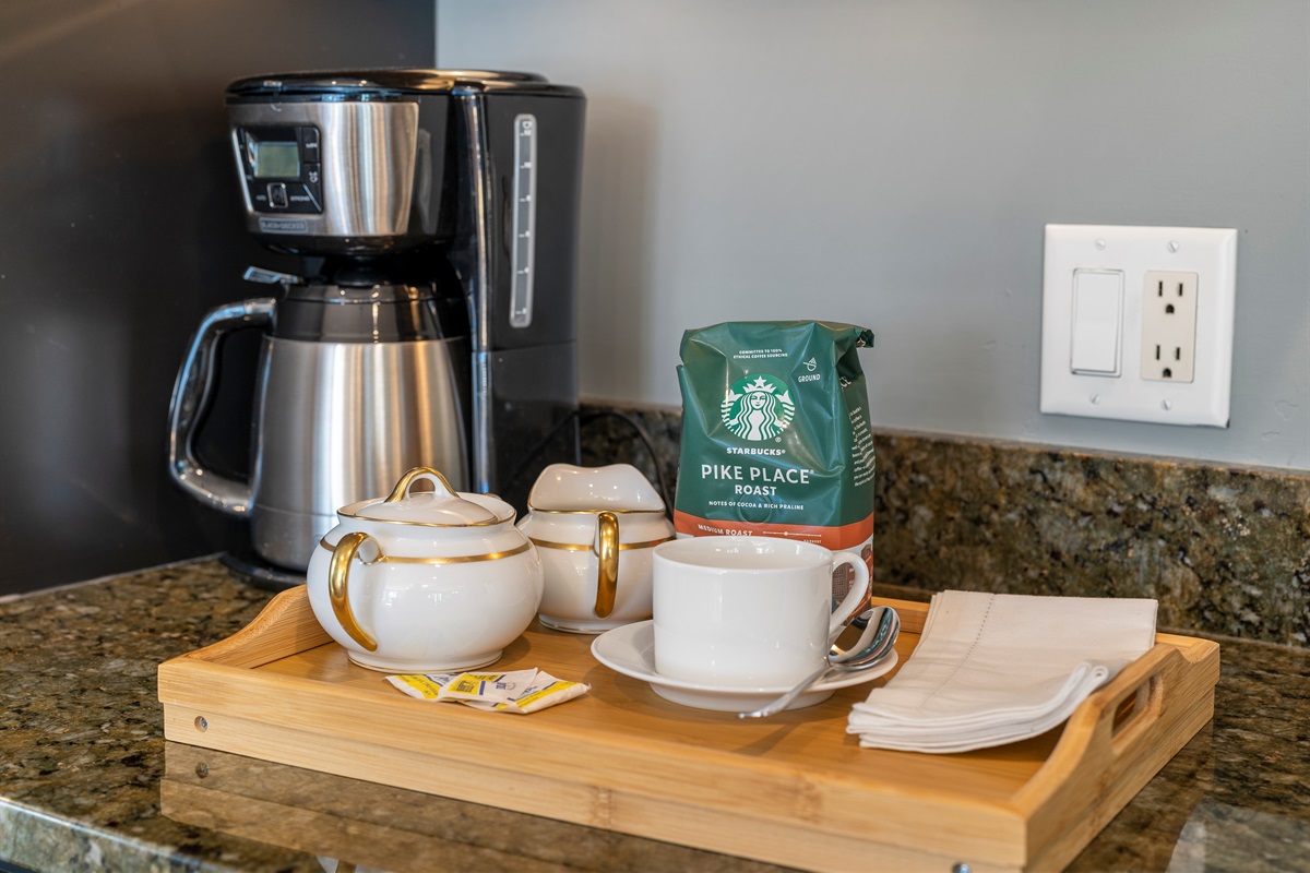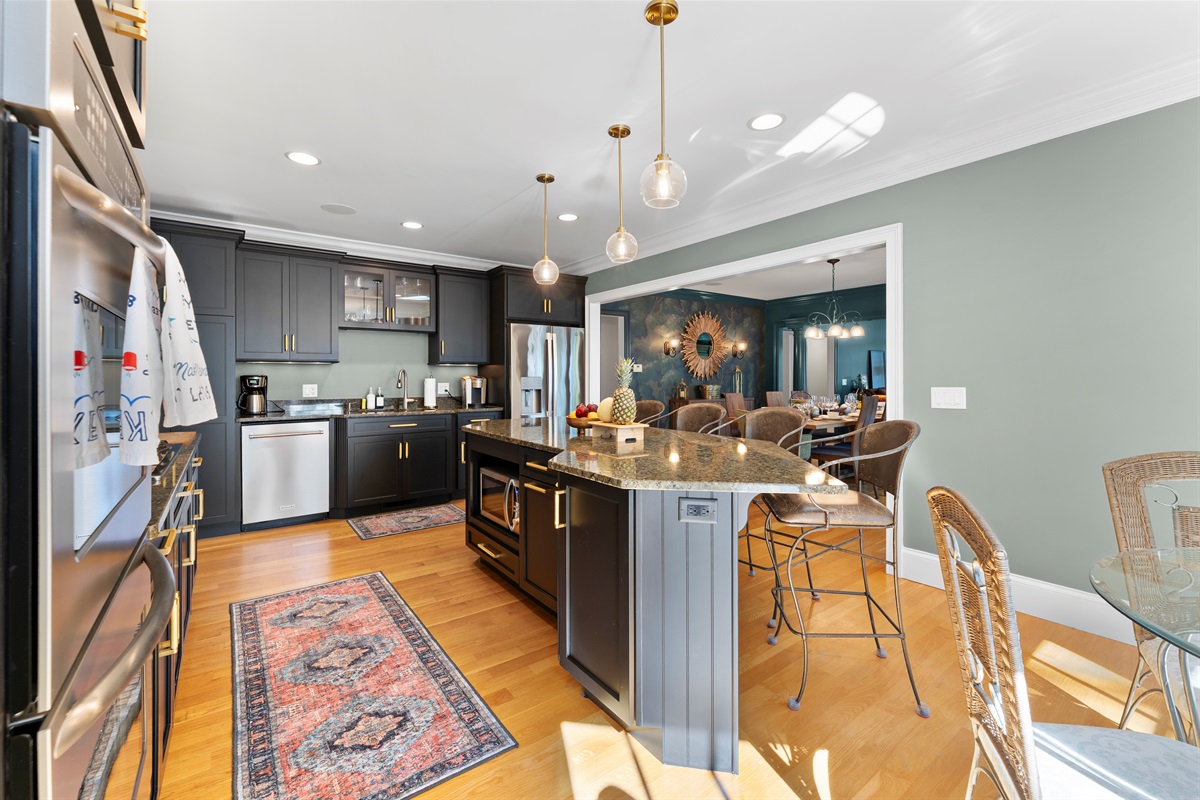 • Fully equipped kitchen with modern appliances, coffee maker, and large island